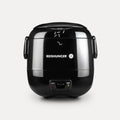 Trotz seiner kompakten Größe überzeugt der Mini Reiskocher mit cleverem Design und einfacher Handhabung. Der keramikbeschichtete Innentopf sorgt für gleichmäßige Wärmeverteilung, während praktische Henkel Transport und Handling erleichtern. Dank der hübschen Farbvarianten Schwarz, Salbeigrün und Hellblau ist der kleine Küchenhelfer zudem ein echter Hingucker. Im Lieferumfang sind außerdem Messbecher und Reislöffel enthalten.